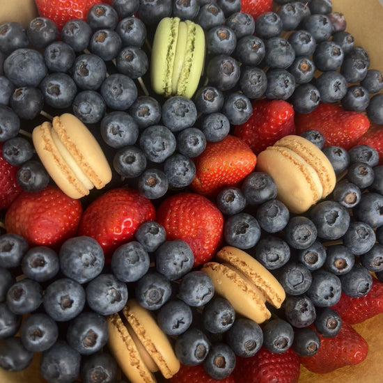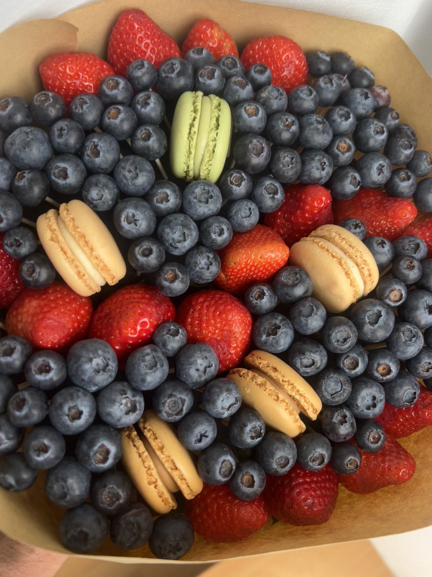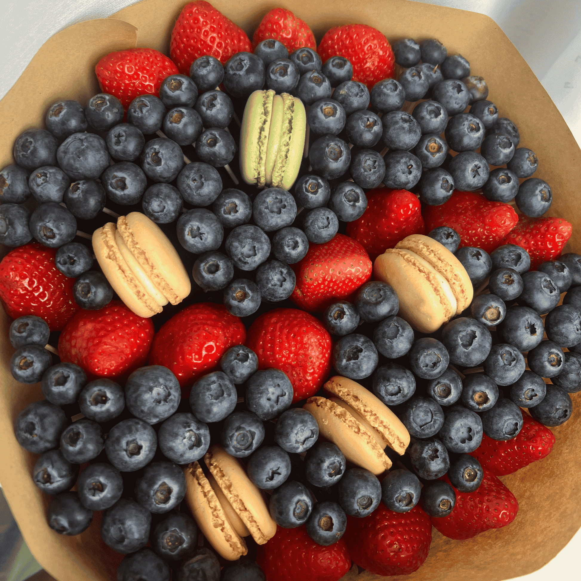 Elegantní jedlý puget plný šťavnatých borůvek, které hrají hlavní roli v tomto sladkém příběhu. Doplněno o něžné makronky a voňavé jahody – kombinace, která potěší oko i chuťové buňky. Ideální dárek pro milovníky lesního ovoce a jemných dezertů.